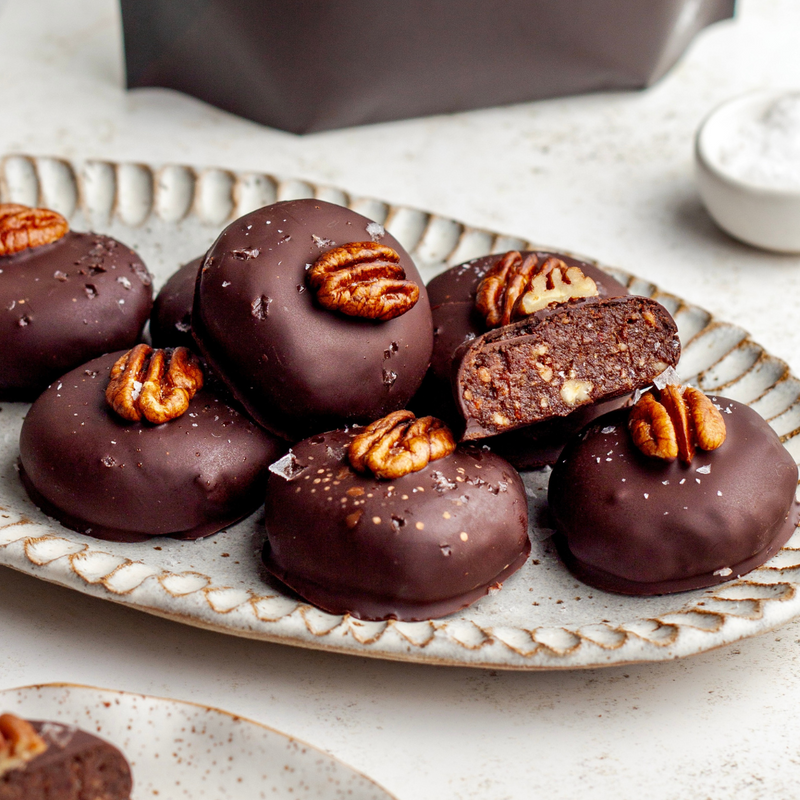 - Dip each flattened ball into the melted chocolate and top with a pecan.