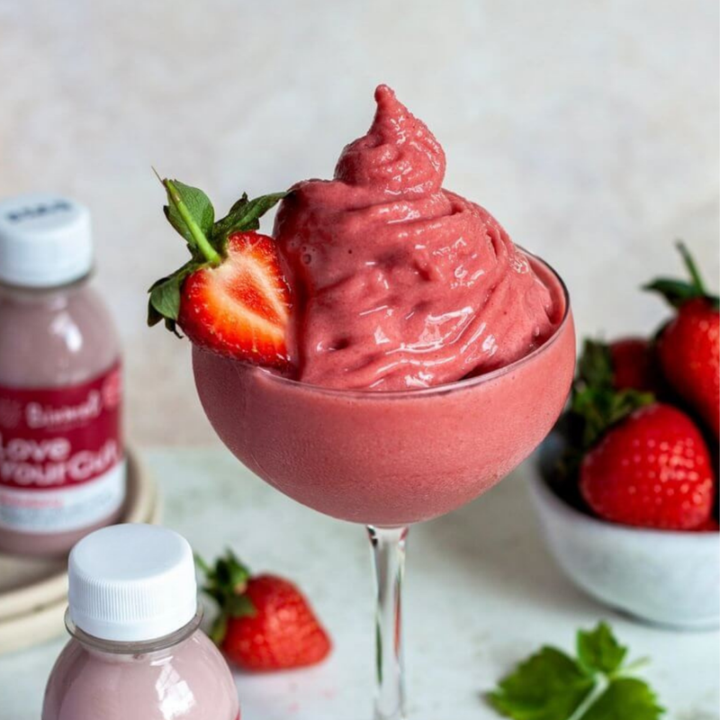 Cool down in style with this instant Strawberry Frozen Yoghurt, creamy, tangy, and bursting with berry goodness. Made with just a handful of nourishing ingredients, including our live-cultured Strawberry Biomel shot, this blender-friendly treat comes together in minutes. Perfect for sunny days, sweet cravings, or a gut-loving dessert twist.